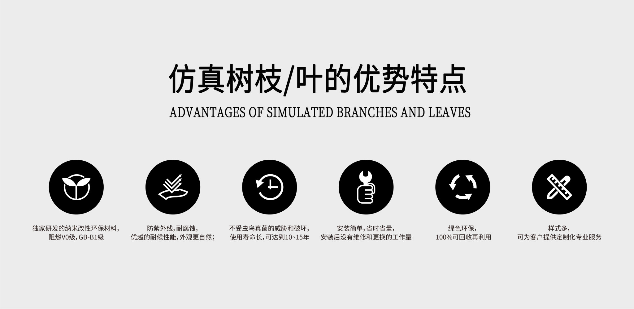 ? ? ? ? 仿真樹枝葉是深圳市科佰工貿(mào)有限公司采用目前國(guó)際上先進(jìn)的納米合成高分子材料技術(shù)和工藝生產(chǎn)。利用納米粒子的特有的物理化學(xué)性質(zhì),使得其具有更加優(yōu)異的耐候性及阻燃性,能滿足美國(guó)ASTM-G154-06 抗UV老化測(cè)試標(biāo)準(zhǔn),并能通過美標(biāo)UL94-V0級(jí)阻燃,在國(guó)內(nèi)仿真樹枝葉也通過了國(guó)家防火建材阻燃測(cè)試B1級(jí)。?