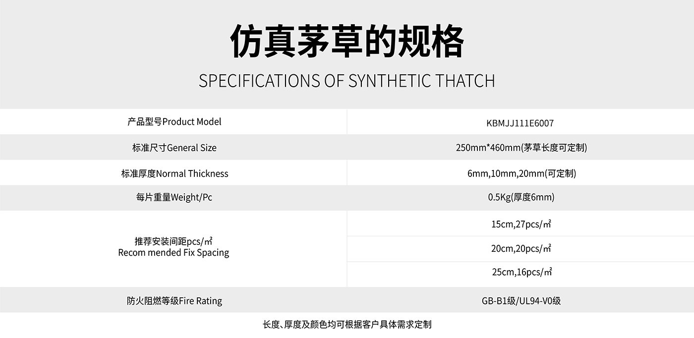 ? ? ? ? 仿真茅草是深圳市科佰工貿(mào)有限公司采用目前國際上先進(jìn)的納米合成高分子材料技術(shù)和工藝生產(chǎn)。利用納米粒子的特有的物理化學(xué)性質(zhì),使得其具有更加優(yōu)異的耐候性及阻燃性,能滿足美國ASTM-G154-06 抗UV老化測試標(biāo)準(zhǔn),并能通過美標(biāo)UL94-V0級阻燃,在國內(nèi)仿真茅草也通過了國家防火建材阻燃測試B1級。?