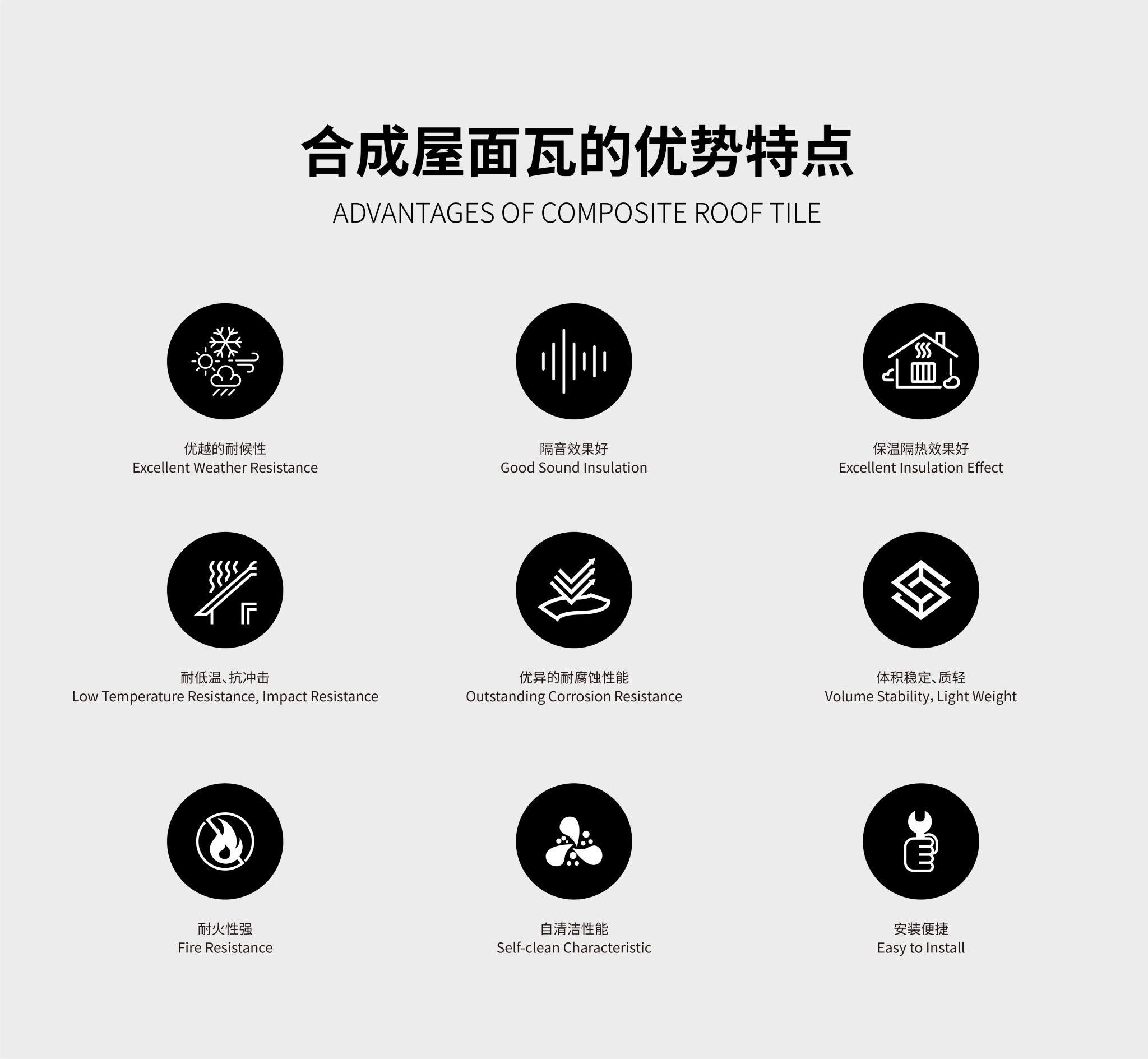 合成木紋瓦具有非常好的耐腐蝕性能,不會(huì)被雨雪侵蝕,并可長時(shí)間抵御酸、堿、鹽等多種化學(xué)物質(zhì)的侵蝕。實(shí)驗(yàn)表明,在40% NaOH﹑40% H2SO4溶液中,侵漬24小時(shí),產(chǎn)品不會(huì)變形或變色。各種微生物也無法在瓦表面生存。